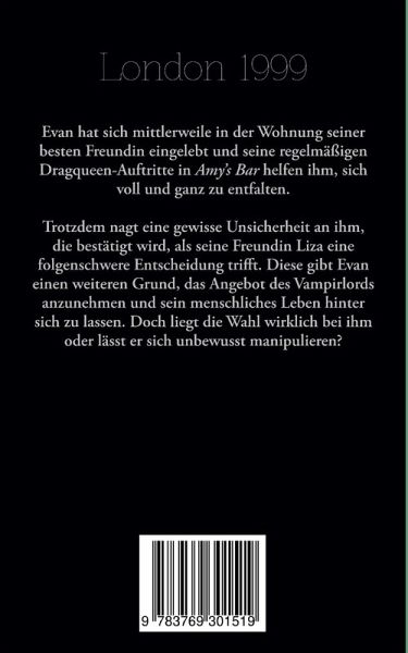 London 1999 Evan hat sich mittlerweile in der Wohnung seiner besten Freundin eingelebt und seine regelmässigen Dragqueen-Auftritte in Amy's Bar helfen ihm, sich voll und ganz zu entfalten. Trotzdem nagt eine gewisse Unsicherheit an ihm, die bestätigt wird, als seine Freundin Liza eine folgenschwere Entscheidung trifft. Diese gibt Evan einen weiteren Grund, das Angebot des Vampirlords anzunehmen und sein menschliches Leben hinter sich zu lassen. Doch liegt die Wahl wirklich bei ihm oder lässt er sich unbewusst manipulieren? Mit Illustrationen von LucifersChoice