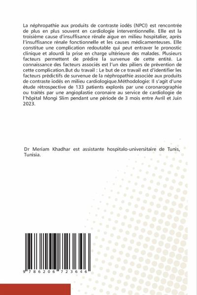 La néphropathie aux produits de contraste iodés (NPCI) est rencontrée de plus en plus souvent en cardiologie interventionnelle. Elle est la troisième cause d'insuffisance rénale aigue en milieu hospitalier, après l'insuffisance rénale fonctionnelle et les causes médicamenteuses. Elle constitue une complication redoutable qui peut entraver le pronostic clinique et alourdi la prise en charge ultérieure des malades. Plusieurs facteurs permettent de prédire la survenue de cette entité. La connaissance des facteurs associés est l'un des piliers de prévention de cette complication.But du travail : Le but de ce travail est d'identifier les facteurs prédictifs de survenue de la néphropathie associée aux produits de contraste iodés en milieu cardiologique.Méthodologie: Il s'agit d'une étude rétrospective de 133 patients explorés par une coronarographie ou traités par une angioplastie coronaire au service de cardiologie de l'hôpital Mongi Slim pendant une période de 3 mois entre Avril et Juin 2023.
