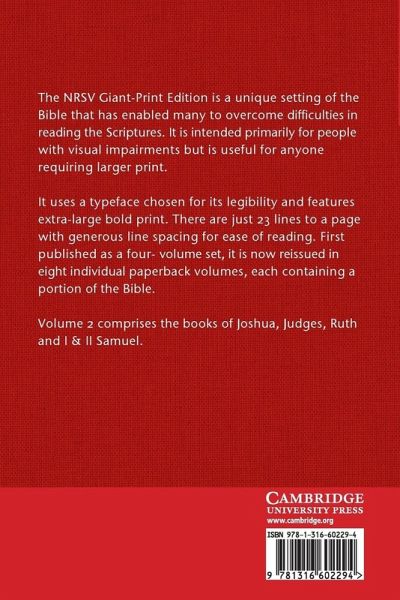 The NRSV Giant-Print Edition is a unique setting of the Bible that has enabled many to overcome difficulties in reading the Scriptures. It is intended primarily for people with visual impairments but is useful for anyone requiring larger print. It uses a typeface chosen for its legibility and features extra-large bold print. There are just 23 lines to a page with generous line spacing for ease of reading. First published as a four-volume set, it is now reissued in eight individual paperback volumes, each containing a portion of the Bible. Volume 2 comprises the books of Joshua, Judges, Ruth and I and II Samuel.