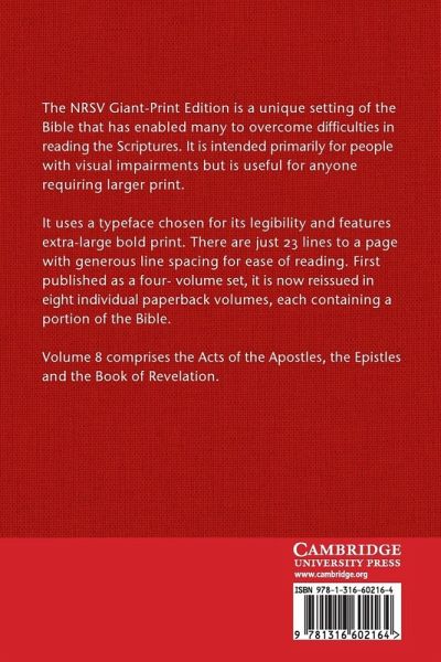 The NRSV Giant-Print Edition is a unique setting of the Bible that has enabled many to overcome difficulties in reading the Scriptures. It is intended primarily for people with visual impairments but is useful for anyone requiring larger print. It uses a typeface chosen for its legibility and features extra-large bold print. There are just 23 lines to a page with generous line spacing for ease of reading. First published as a four-volume set, it is now reissued in eight individual paperback volumes, each containing a portion of the Bible. Volume 8 comprises the Acts of the Apostles, the Epistles and the Book of Revelation.