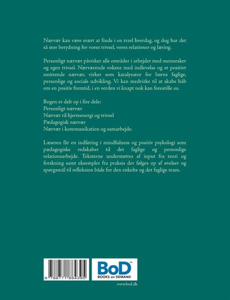 Nærvær kan være svært at finde i en travl hverdag, og dog har det så stor betydning for vores trivsel, vores relationer og læring. Personligt nærvær påvirker alle områder i arbejdet med mennesker og egen trivsel. Nærværende voksne med indlevelse og et positivt smittende nærvær, virker som katalysator for børns faglige, personlige og sociale udvikling. Vi kan medvirke til at skabe håb om en positiv fremtid, i en verden vi knapt nok kan forestille os. Bogen er delt op i fire dele: 1) Personligt nærvær 2) Nærvær til hjerteenergi og trivsel 3) Pædagogisk nærvær 4) Nærvær i kommunikation og samarbejde. Læseren får en indføring i mindfulness og positiv psykologi som pædagogiske redskaber til det faglige og personlige relationsarbejde. Teksterne understøttes af input fra teori og forskning samt eksempler fra praksis der følges op af øvelser og spørgsmål til refleksion både for den enkelte og det faglige team.