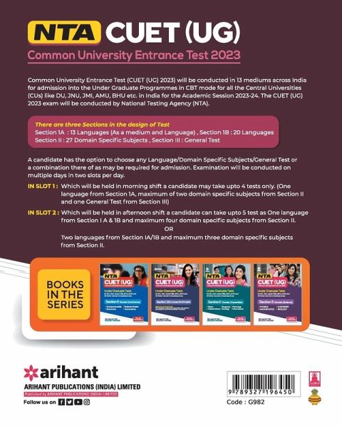 Under the Ministry of Education, The Common University Entrance Test is conducted to take admission into all UG Programmes in all Central Universities. To succeed in the exam, students need to grasp the concepts in an easy & comprehensible manner. Here is presenting the revised edition of "NTA CUET (UG) 2023- SECTION III General Test" which has been prepared strictly as per the latest syllabus and pattern of NTA. This book divides the entire syllabus into 5 major sections along with well-explained theories with diagrams, charts, etc. Current Affairs will support aspirants to acknowledge events of national & international importance relevant to the exam. Solved Paper 2022 & Practice Sets (1-5) are also accumulated to make aspirants well acquainted with the exam pattern. It is a must-have book for aspirants who aspire to do well in the NTA CUET (UG) Exam 2023. This book offers: 1. A complete study & practice material for NTA CUET (UG) 2023 2. Designed as per the latest prescribed format 3. Divides the syllabus into 5 sections 4. 5 practice sets are provided to revise the concepts 5. Latest Solved Paper 2022 is offered to understand exam pattern TABLE OF CONTENT: Current Affairs, Solved Paper 2022, General Knowledge, General Mental Ability, Numerical Ability, Quantitative Reasoning, Logical and Analytical Reasoning, Practice Sets (1-5)