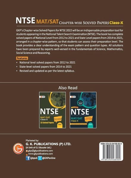 GKP's Chapter-wise Solved Papers for NTSE 2021 will be an indispensable preparation tool for students appearing in the National Talent Search Examination (NTSE). The book has complete solved papers of National Level from 2012 to 2021 and State Level papers from 2014 to 2021, arranged in a chapter-wise pattern, so that students can assess their preparation level. The book provides a clear understanding of the exam pattern and question types. All solutions have been prepared by experts well-versed in the fundamentals of Science, Mathematics, Social Science and Reasoning. Features: 1. National level solved papers from 2012 to 2021 2. State-level solved papers from 2014 to 2021. 3. Revised and updated as per the latest syllabus.