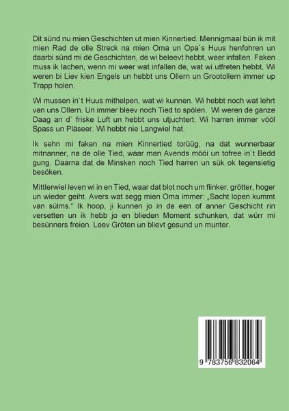 Dit weeren nu mien Geschichten ut mien Kinnertied. Mennigmaal bün ik mit mien Rad de olle Streck na mien Oma un Opa`s Huus henfohren un daarbi sünd mi de Geschichten, de wi beleevt hebbt, weer infallen. Faken muss ik lachen, wenn mi weer wat infallen de, wat wi utfreten hebbt. Wi weren bi Liev kien Engels un hebbt uns Ollern un Grootollern immer up Trapp holen.Wi mussen in`t Huus mithelpen, wat wi kunnen. Wi hebbt noch wat lehrt van uns Ollern. Un immer bleev noch Tied to spölen. Wi weren de ganze Daag an d` friske Luft un hebbt uns utjuchtert. Wi harren immer vööl Spass un Pläseer. Wi hebbt nie Langwiel hat.Ik sehn mi faken na mien Kinnertied torüüg, na dat wunnerbaar mitnanner, na de olle Tied, waar man Avends mööi un tofree in`t Bedd gung. Daarna dat de Minsken noch Tied harren un sük ok tegensietig besöken. Mittlerwiel leven wi in en Tied, waar dat blot noch um flinker, grötter, hoger un wieder geiht. Avers wat segg mien Oma immer: -Sacht lopen kummt van sülms.-