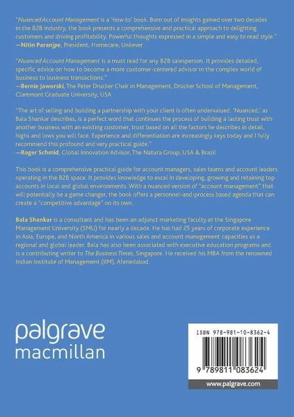 This book is a comprehensive practical guide for account managers, sales teams and account leaders operating in the B2B space. It provides knowledge to excel in developing, growing and retaining top accounts in local and global environments. With a nuanced version of 'account management' that will potentially be a game changer, the book offers a personnel-and-process based agenda that can create a 'competitive advantage' on its own.