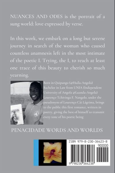 COVER CONCEPT Softcover 6×9 in, 15×23 cm . SYNOPSIS NUANCES AND ODES is the portrait of a sung world: love expressed by verse. In this work, we embark on a long but serene journey in search of the woman who caused countless anamnesis left in the most intimate of the poetic I. Trying, the I, to reach at least one trace of this beauty to cherish so much yearning. . TITLE Nuances and Odes . AUTHOR Lourenço Cái Lágrima . TRANSLATION Ares Jonor Etsica . COVER EDITION Jarres Jonor Etsica . PUBLISHER Penacidade Words and Worlds . GENRE Romance . FORM Poetry . TYPE Fiction +16 . LANGUAGE English . MOTHER LANGUAGE Portuguese . PAGES 132 . PAGES WITH IMAGE 0