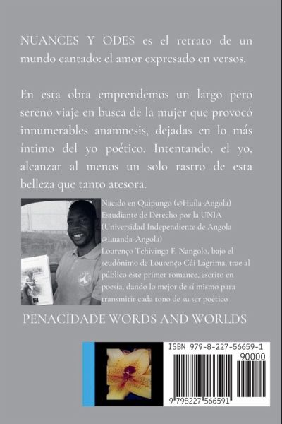 CONCEPTO DE PORTADA Softcover 6×9 in, 15×23 cm . SINOPSIS NUANCES Y ODES es el retrato de un mundo cantado: el amor expresado en versos. En esta obra emprendemos un largo pero sereno viaje en busca de la mujer que provocó innumerables anamnesis, dejadas en lo más íntimo del yo poético. Intentando, el yo, alcanzar al menos un solo rastro de esta belleza que tanto atesora. . TÍTULO Nuances y Odes . AUTOR Lourenço Cái Lágrima . TRADUCCIÓN Oriana Cepeda . EDICIÓN DE PORTADA Jarres Jonor Etsica . EDITORIAL Penacidade Words and Worlds . GÉNERO Romance . FORMA Poesía . TIPO Ficción +16 . LENGUA Español . LENGUA MADRE Portugues . PÁGINAS 132 . PÁGINAS CON IMAGEN 0