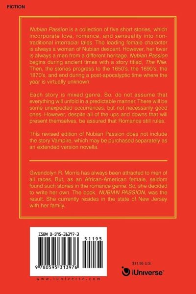 Nubian Passion is a collection of five short stories, which incorporate love, romance, and sensuality into non-traditional interracial tales. The leading female character is always a woman of Nubian descent. However, her lover is always a man from a different heritage. Nubian Passion begins during ancient times with a story titled, The Nile. Then, the stories progress to the 1650's, the 1690's, the 1870's, and end during a post-apocalyptic time where the year is virtually unknown. Each story is mixed genre. So, do not assume that everything will unfold in a predictable manner. There will be some unexpected occurrences, but not necessarily good ones. However, despite all of the ups and downs that will present themselves, be assured that Romance still rules. This revised edition of Nubian Passion does not include the story Vampire, which may be purchased separately as an extended version novella.