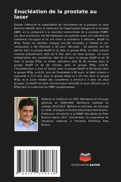 Évaluer l'efficacité et l'applicabilité de l'énucléation de la prostate au laser Holmium (HoLEP) dans le traitement de l'hypertrophie bénigne de la prostate (HBP), en la comparant à la résection transurétrale de la prostate (TURP). Les deux procédures ont été expliquées aux patients ayant une indication de traitement chirurgical et ils ont choisi la procédure à effectuer, HoLEP ou RTUp. Toutes les données cliniques ont été recueillies à l'hôpital et une réévaluation a été effectuée à 90 jours. Résultats : 20 patients ont été opérés dans le groupe HoLEP et 21 dans le groupe RTUp. Le débit urinaire maximal préopératoire était de 8 ml/s dans les deux groupes. Le score préopératoire des symptômes était de 22 dans le groupe HoLEP et de 20 dans le groupe RTUp. Le temps opératoire était de 85 minutes dans le groupe HoLEP et de 60 minutes dans le groupe RTUp, p<0,05. L'hospitalisation a duré 47 heures dans le groupe HoLEP et 48 heures dans le groupe RTUp, p<0,05. Lors de l'évaluation à 90 jours, le débit urinaire a augmenté à 21,5 ml/s dans le groupe Holep et à 20 ml/s dans le groupe RTUp, et le score médian des symptômes a diminué à 3 dans les deux groupes. La HoLEP est donc une technique réalisable et aussi efficace que la RTUp dans le traitement de l'HBP symptomatique.