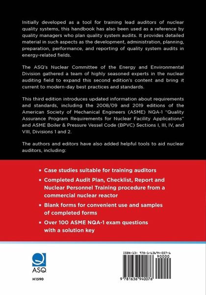 Initially developed as a tool for training lead auditors of nuclear quality systems, the Nuclear Auditing Handbook has also been used as a reference by quality managers who plan quality system audits. It provides detailed material in such aspects as the development, administration, planning, preparation, performance, and reporting of quality system audits in energy-related fields. ASQ's Nuclear Committee of the Energy and Environment Division gathered a team of highly seasoned experts in the nuclear auditing field to expand this new edition's content and bring it current to modern-day best practices and standards. This book introduces updated information about requirements and standards, including the 2019 editions of the American Society of Mechanical Engineers (ASME) NQA-1 Quality Assurance Program Requirements for Nuclear Facility Applications and ASME BPVC Sections I; IV; and VIII, Divisions 1 and 2. The authors and editors have also added helpful tools to aid nuclear auditors, including case studies suitable for training auditors, blank forms for convenient use, and samples of completed forms.