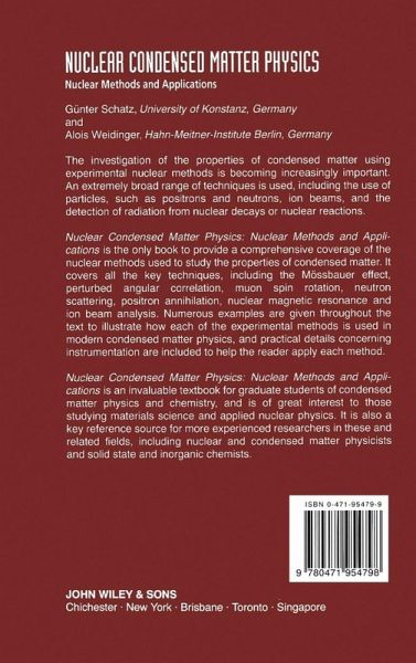 The investigation of the properties of condensed matter using experimental nuclear methods is becoming increasingly important. An extremely broad range of techniques is used, including the use of particles, such as positrons and neutrons, ion beams, and the detection of radiation from nuclear decays or nuclear reactions. Nuclear Condensed Matter Physics: Nuclear Methods and Applications is the only book to provide a comprehensive coverage of the nuclear methods used to study the properties of condensed matter. It covers all the key techniques, including the Mössbauer effect, perturbed angular correlation, muon spin rotation, neutron scattering, positron annihilation, nuclear magnetic resonance and ion beam analysis. Numerous examples are given throughout the text to illustrate how each of the experimental methods is used in modern condensed matter physics, and practical details concerning instrumentation are included to help the reader apply each method. Nuclear Condensed Matter Physics: Nuclear Methods and Applications is an invaluable textbook for graduate students of condensed matter physics and chemistry, and is of great interest to those studying materials science and applied nuclear physics. It is also a key reference source for more experienced researchers in these and related fields, including nuclear and condensed matter physicists and solid state and inorganic chemists.