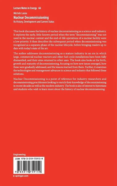 This book discusses the history of nuclear decommissioning as a science and industry. It explores the early, little-known period when the term "decommissioning" was not used in the nuclear context and the end-of-life operations of a nuclear facility were a low priority. It then describes the subsequent period when decommissioning was recognized as a separate phase of the nuclear lifecycle, before bringing readers up to date with today's state of the art.