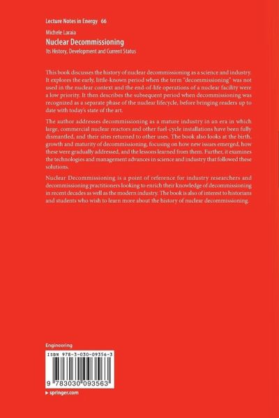 This book discusses the history of nuclear decommissioning as a science and industry. It explores the early, little-known period when the term "decommissioning" was not used in the nuclear context and the end-of-life operations of a nuclear facility were a low priority. It then describes the subsequent period when decommissioning was recognized as a separate phase of the nuclear lifecycle, before bringing readers up to date with today's state of the art.