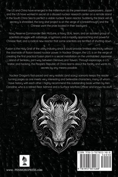 The US and China have emerged in the millennium as the preeminent superpowers. Japan and the US have worked in secret at a disused nuclear research center on a remote island in the South China Sea to pefect a viable nuclear fusion reactor. Suddenly the black veil of secrecy is shredded, the long shot project is on the verge of a breakthrough, and the Chinese want the prize located in their backyard.Navy Reserve Commander Ben McGuire, a Navy SEAL team, and an isolated group of scientists struggle with sabotage, a typhoon, and a rapidly approaching and powerful Chinese fleet, and a radical new reactor that some scientists are terrified of shutting down.Fission is the Holy Grail of the utility industry since it could provide limitless electricity without the downside of fusion based nuclear power. In Nuclear Dragon, the U.S. is on the verge of creating the first practical fission plant in a secret installation on the uninhabited Japanese island of Senkaku, part-way between Okinawa and Taiwan. Through espionage, a U.S. traitor, and hacking, the People's Republic of China learns about the facility and wants its secrets by any means possible. Nuclear Dragon's fast-paced and very realistic (and scary) scenario keeps the reader turning pages as one meets very interesting and believable characters, many of whom have history with each other. I highly recommend this outstanding book written by Ken Carodine, who is a retired Rear Admiral and a Surface Warfare Officer and knows his stuff.