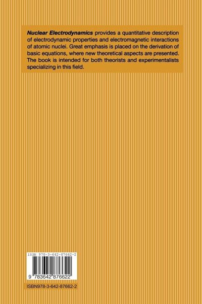 "Nuclear Electrodynamics" quantitatively describes bothnuclear electromagnetic properties and processes of theelectromagnetic interaction.The main emphasis is on thederivation of basic equations. The book is intended for boththeorists and experimentalists specializing in this field.Contents:- Introduction- Electromagnetic Multipole Moments- Interaction Between Nuclei and Electromagnetic Radiation- Electron-Nucleus Interaction (Elastic and Inelastic Scattering)- Electron-Nucleus Interaction (Nuclear Electrodisintegration and Inclusive Processes)- Electromagnetic Interaction between Heavy Charged Particles and Nuclei- References- Subject Index
