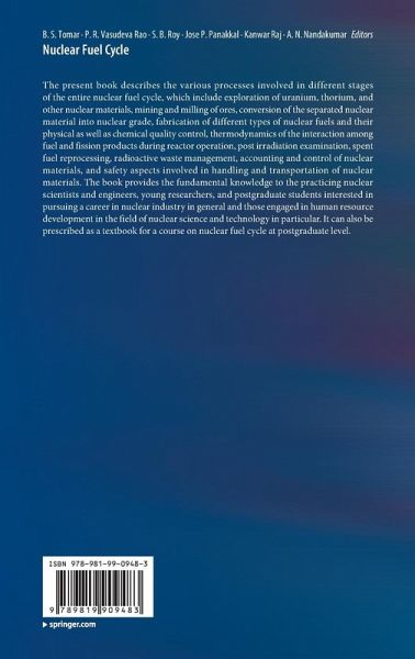 Chapter 1. Nuclear Fuel Cycle: Introduction.- Chapter 2. Exploration, mining, milling and processing of Uranium.- Chapter 3. Fabrication of Nuclear Fuel Elements.- Chapter 4. Quality Control of Nuclear Fuels.- Chapter 5. Thermophysical and thermochemical properties of nuclear fuels.- Chapter 6. Post-Irradiation Examination of Fuel.- Chapter 7. Nuclear Fuel Reprocessing.- Chapter 8. Radioactive Waste Management.- Chapter 9. Accounting and Control of Nuclear Materials.- Chapter 10. Transport and Storage of Nuclear Materials.- Chapter 11. Radiation Protection.