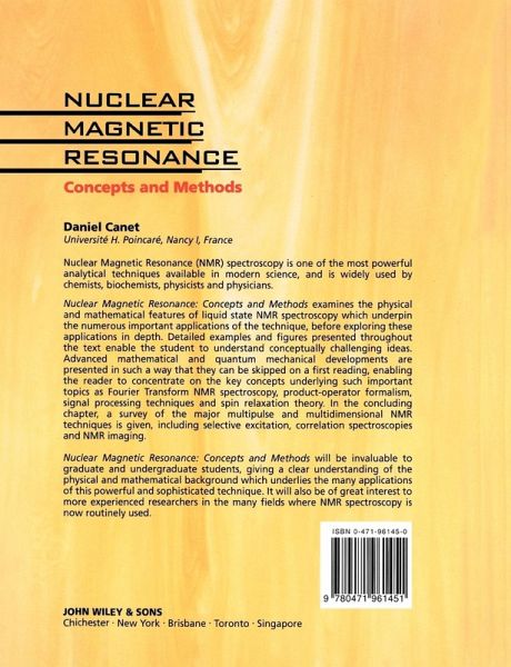 Nuclear Magnetic Resonance (NMR) spectroscopy is one of the most powerful analytical techniques available in modern science, and is widely used by chemists, biochemists, physicists and physicians. Nuclear Magnetic Resonance: Concepts and Methods examines the physical and mathematical features of liquid state NMR spectroscopy which underpin the numerous important applications of the technique, before exploring these applications in depth. Detailed examples and figures presented throughout the text enable the student to understand conceptually challenging ideas. Advanced mathematical and quantum mechanical developments are presented in such a way that they can be skipped on a first reading, enabling the reader to concentrate on the key concepts underlying such important topics as Fourier Transform NMR spectroscopy, product-operator formalism, signal processing techniques and spin relaxation theory. In the concluding chapter, a survey of the major multipulse and multidimensional NMR techniques is given, including selective excitation, correlation spectroscopies and NMR imaging.