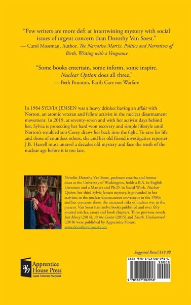 In 1984 SYLVIA JENSEN was a heavy drinker having an affair with Norton, an atomic veteran and fellow activist in the nuclear disarmament movement. In 2019, at seventy-seven and with her activist days behind her, Sylvia is protecting her hard-won recovery and simple lifestyle until Norton’s troubled son Corey draws her back into the fight. To save his life and those of countless others, she and her old friend investigative reporter J.B. Harrell must unravel a decades old mystery and face the truth of the nuclear age before it is too late.