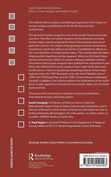 This edited volume explores competing perspectives on the impact of nuclear weapons proliferation on the South Asian security environment. The spread of nuclear weapons is one of the world's foremost security concerns. The effect of nuclear weapons on the behaviour of newly nuclear states, and the potential for future international crises, are of particular concern. As a region of burgeoning economic and political importance, South Asia offers a crucial test of proliferation's effects on the crisis behaviour of newly nuclear states. This volume creates a dialogue between scholars who believe that nuclear weapons have stabilized the subcontinent, and those who believe that nuclear weapons have made South Asia more conflict prone. It does so by pairing competing analyses of four major regional crises: the 1987 "Brasstacks" crisis, the Indo-Pakistani crisis of 1990, the 1999 Kargil war, which occurred after the nuclear tests; and the 2001-2 Indo-Pakistani militarized standoff. In addition, the volume explores the implications of the South Asian nuclear experience for potential new nuclear states such as North Korea and Iran.