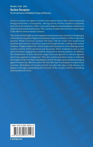 1. Molecular Pharmacology of the Youngest Member of the Nuclear Receptor Family: The Mineralocorticoid Receptor.- 2. A Simple Method for Visual Assessment and Quantification of Altered Subcellular Localization of Nuclear Receptors.- 3. Multifaceted Effects of Ligand on Nuclear Receptor Mobility.- 4. Chemical Considerations in Discovery of Receptor Modulators.- 5. Structure-Based Design of Estrogen-Related Receptors Modulators.- 6. PPAR and d ligand design - Honing the traditional empirical method with a more holistic overview.- 7. Pregnane X Receptor: understanding its function and activity at the molecular level.- 8. Ligand Design for the Vitamin D Receptor.- 9. What Makes a Good Antagonist: Lessons Learned from the Estrogen and Aryl Hydrocarbon Receptors.- 10. Design of Novel PPAR agonist for Neurodegenerative Disease.- 11. Functional bioassays lithograph ligand reflections in the PPARalpha sphere.- 12. Computational applications on Food Contact Chemicals as Nuclear Receptors binders.- 13. Alternation of Nuclear Hormone Receptor Signaling by Antiviral Drugs.- 14. Retinoic acid-related orphan receptor (ROR) inverse agonists: potential therapeutic strategies for multiple inflammatory diseases.- 15. Therapeutic Strategies to Target Activating Estrogen Receptor a Mutation.- 16. Androgen Receptors in the Pathology of Disease.- 17. Bilirubin: A Ligand of the PPAR Nuclear Receptor.- 18. Nuclear Receptor Ligands in Flavivirus Infection Control.- 19. Use of Nanotechnology to Improve 15d-PGJ2 Immunomodulatory Activities.- 20.Ligand-independent Activation of PPARs.- 21. PPAR Modulation Through Posttranslational Modification Control.- 22. Developing Inhibitors to the Amino-Terminus Domains of Steroid Hormone Receptors.- 23. Redirecting the cellular waste disposal machinery to target transcription.