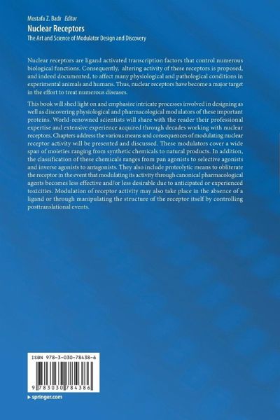 1. Molecular Pharmacology of the Youngest Member of the Nuclear Receptor Family: The Mineralocorticoid Receptor.- 2. A Simple Method for Visual Assessment and Quantification of Altered Subcellular Localization of Nuclear Receptors.- 3. Multifaceted Effects of Ligand on Nuclear Receptor Mobility.- 4. Chemical Considerations in Discovery of Receptor Modulators.- 5. Structure-Based Design of Estrogen-Related Receptors Modulators.- 6. PPAR and d ligand design - Honing the traditional empirical method with a more holistic overview.- 7. Pregnane X Receptor: understanding its function and activity at the molecular level.- 8. Ligand Design for the Vitamin D Receptor.- 9. What Makes a Good Antagonist: Lessons Learned from the Estrogen and Aryl Hydrocarbon Receptors.- 10. Design of Novel PPAR agonist for Neurodegenerative Disease.- 11. Functional bioassays lithograph ligand reflections in the PPARalpha sphere.- 12. Computational applications on Food Contact Chemicals as Nuclear Receptors binders.- 13. Alternation of Nuclear Hormone Receptor Signaling by Antiviral Drugs.- 14. Retinoic acid-related orphan receptor (ROR) inverse agonists: potential therapeutic strategies for multiple inflammatory diseases.- 15. Therapeutic Strategies to Target Activating Estrogen Receptor a Mutation.- 16. Androgen Receptors in the Pathology of Disease.- 17. Bilirubin: A Ligand of the PPAR Nuclear Receptor.- 18. Nuclear Receptor Ligands in Flavivirus Infection Control.- 19. Use of Nanotechnology to Improve 15d-PGJ2 Immunomodulatory Activities.- 20.Ligand-independent Activation of PPARs.- 21. PPAR Modulation Through Posttranslational Modification Control.- 22. Developing Inhibitors to the Amino-Terminus Domains of Steroid Hormone Receptors.- 23. Redirecting the cellular waste disposal machinery to target transcription.