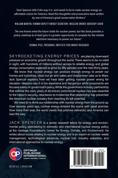 Skyrocketing energy prices are placing downward pressure on economic growth throughout the world. There seems to be no relief in sight, with hundreds of millions without access to reliable energy and with global energy consumption expected to grow by 50 percent over the next 30 years. Some would impose energy rationing¿or in other words, slow human progress. But with nearly 46 percent of the world's population living on less than $5.50 per day, slowing human progress is unacceptable. The only solution is more energy and lots of it. Jack Spencer, in his upcoming book, Going Nuclear: Reestablishing American Commercial Nuclear Dominance, argues that nuclear energy offers real answers to power our homes and industries, clean our air and water, and maybe even take us to Mars. However, we have been getting nuclear power wrong for decades. Skeptics say that nuclear energy is too expensive and threatens the world with the proliferation of nuclear weapons material and radioactive waste. Proponents say that nuclear power needs and deserves the support of the state and the taxpayer, cradle to grave. The time has come, Spencer argues, to think big nuclear energy and pull it out of the time capsule that pop culture, environmental activists, lobbyists, peaceniks, and policymakers are all too content to leave nuclear in. Spencer writes that while the government-industry partnership that defined the early years of America's commercial nuclear rise was essential to the nation's security, reluctance to modernize that relationship has prevented the American nuclear industry from reaching its full potential. In its place, Spencer offers an alternative that shatters how we think about nuclear energy policy and realigns the responsibilities of government and industry with the incentives that will drive America to success. Going Nuclear describes why government intervention in the nuclear industry is a problem, how to move from the status quo to something new, and why such reforms will kick off an era of nuclear entrepreneurship and innovation. Over 70 years ago, nuclear energy entered the scene with great promise. Now more than ever, the world needs that promise delivered, and America can lead the way.