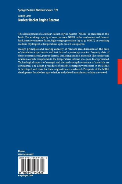 This monograph recounts and details the development of a nuclear rocket engine reactor (NRER). In particular, it explains the working capacity of an active zone NRER under mechanical and thermal load, intensive neutron fluxes, and high-energy generation (up to 30 MBT/l) in a working medium (hydrogen) at temperatures up to 3100 K. The design principles and bearing capacity of reactors area discussed on the basis of simulation experiments and test data of a prototype reactor. Property data of dense constructional, porous thermal insulating and fuel materials such as carbide and uranium carbide compounds in the temperatures interval 300 - 3000 K are presented.; technological aspects of strength and thermal strength resistance of materials are also considered. As well, a procedure to design possible emergency processes in the NRER is developed and risks for their origination are evaluated. Finally, prospects for use in pilotless space devices and piloted interplanetary ships are reviewed.