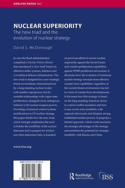 In 2002 the Bush administration completed a Nuclear Posture Review that introduced a 'new triad' based on offensive-strike systems, defences and a revitalized defence infrastructure. The new triad is designed for a new strategic threat environment, characterized not by a long-standing nuclear rivalry with another superpower, but by unstable relationships with rogue-state proliferators, alongside more ambiguous relations with nuclear-weapon powers. Providing a historical context to these modifications to US nuclear strategy, Nuclear Superiority details how the new triad, which strongly emphasizes the need to bolster the credibility of the nuclear deterrent and to prepare for nuclear use when deterrence fails, is founded on previous efforts to secure nuclear superiority against the Soviet Union and counter-proliferation capabilities against WMD-proliferant adversaries. It illustrates how the evolution of American nuclear strategy towards more effective counter-force capabilities, regardless of the current threat environment, has led to a host of counter-force developments. David S. McDonough explores how this strategy is based on the long-standing American desire to control conflict escalation and how it may invite crisis instability with regional adversaries and disquiet among established nuclear powers.