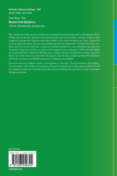 Practical and easy to follow, Nucleic Acid Aptamers: Selection, Characterization, and Application provides a state-of-the-art summary of recent developments in the aptamer field and will be a helpful resource for scientists in the life sciences working with aptamers as tools to elucidate biological systems.