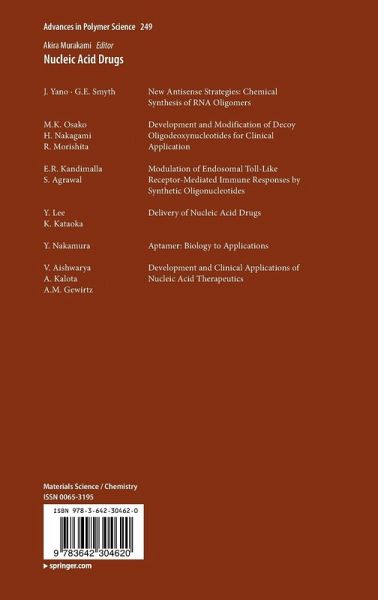 New Antisense Strategies: Chemical Synthesis of RNA Oligomers, by Junichi Yano und Gerald E. SmythDevelopment and Modification of Decoy Oligodeoxynucleotides for Clinical Application, by Mariana Kiomy Osako, Hironori Nakagami und Ryuichi MorishitaModulation of Endosomal Toll-Like Receptor-Mediated Immune Responses by Synthetic Oligonucleotides, by Ekambar R. Kandimalla und Sudhir AgrawalDelivery of Nucleic Acid Drugs, by Yan Lee und Kazunori KataokaAptamer: Biology to Applications, by Yoshikazu NakamuraDevelopment and Clinical Applications of Nucleic Acid Therapeutics, by Veenu Aishwarya, Anna Kalota und Alan M. Gewirtz