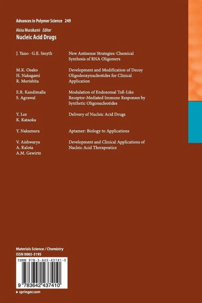 New Antisense Strategies: Chemical Synthesis of RNA Oligomers, by Junichi Yano und Gerald E. SmythDevelopment and Modification of Decoy Oligodeoxynucleotides for Clinical Application, by Mariana Kiomy Osako, Hironori Nakagami und Ryuichi MorishitaModulation of Endosomal Toll-Like Receptor-Mediated Immune Responses by Synthetic Oligonucleotides, by Ekambar R. Kandimalla und Sudhir AgrawalDelivery of Nucleic Acid Drugs, by Yan Lee und Kazunori KataokaAptamer: Biology to Applications, by Yoshikazu NakamuraDevelopment and Clinical Applications of Nucleic Acid Therapeutics, by Veenu Aishwarya, Anna Kalota und Alan M. Gewirtz
