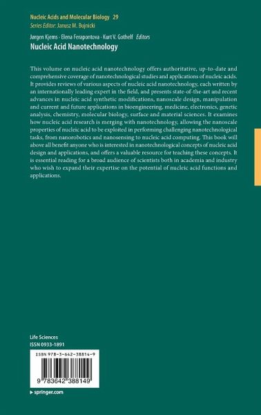 This volume on nucleic acid nanotechnology offers authoritative, up-to-date and comprehensive coverage of nanotechnological studies and applications of nucleic acids. It provides reviews of various aspects of nucleic acid nanotechnology, each written by an internationally leading expert in the field, and presents state-of-the-art and recent advances in nucleic acid synthetic modifications, nanoscale design, manipulation and current and future applications in bioengineering, medicine, electronics, genetic analysis, chemistry, molecular biology, surface and material sciences. It examines how nucleic acid research is merging with nanotechnology, allowing the nanoscale properties of nucleic acid to be exploited in performing challenging nanotechnological tasks, from nanorobotics and nanosensing to nucleic acid computing. This book will above all benefit anyone who is interested in nanotechnological concepts of nucleic acid design and applications, and offers a valuable resource for teaching these concepts. It is essential reading for a broad audience of scientists both in academia and industry who wish to expand their expertise on the potential of nucleic acid functions and applications.