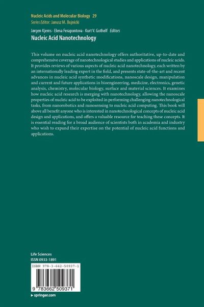 This volume on nucleic acid nanotechnology offers authoritative, up-to-date and comprehensive coverage of nanotechnological studies and applications of nucleic acids. It provides reviews of various aspects of nucleic acid nanotechnology, each written by an internationally leading expert in the field, and presents state-of-the-art and recent advances in nucleic acid synthetic modifications, nanoscale design, manipulation and current and future applications in bioengineering, medicine, electronics, genetic analysis, chemistry, molecular biology, surface and material sciences. It examines how nucleic acid research is merging with nanotechnology, allowing the nanoscale properties of nucleic acid to be exploited in performing challenging nanotechnological tasks, from nanorobotics and nanosensing to nucleic acid computing. This book will above all benefit anyone who is interested in nanotechnological concepts of nucleic acid design and applications, and offers a valuable resource for teaching these concepts. It is essential reading for a broad audience of scientists both in academia and industry who wish to expand their expertise on the potential of nucleic acid functions and applications.