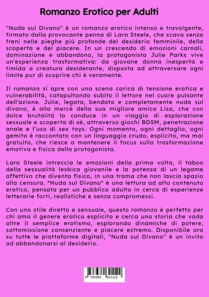 "Nuda sul Divano" è un romanzo erotico intenso e travolgente, firmato dalla provocante penna di Lara Steele, che scava senza freni nelle pieghe più profonde del desiderio femminile, della scoperta e del piacere. In un crescendo di emozioni carnali, dominazione e abbandono, la protagonista Julie Parks vive un'esperienza trasformativa: da giovane donna inesperta e timida a creatura desiderante, disposta ad attraversare ogni limite pur di scoprire chi è veramente.Il romanzo si apre con una scena carica di tensione erotica e vulnerabilità, catapultando subito il lettore nel cuore pulsante dell'azione. Julie, legata, bendata e completamente nuda sul divano, è alla mercé della sua migliore amica Lisa, che con dolce brutalità la conduce in un viaggio di esplorazione sessuale e scoperta di sé, attraverso giochi BDSM, penetrazione anale e l'uso di sex toys. Ogni momento, ogni dettaglio, ogni gemito è raccontato con un linguaggio crudo, esplicito, ma mai gratuito, che riesce a mantenere ilfocus sulla trasformazione emotiva e fisica della protagonista.Lara Steele intreccia le emozioni della prima volta, il taboo della sessualità lesbica giovanile e la potenza di un legame affettivo che diventa fisico, in una trama che non lascia spazio alla censura. _Nuda sul Divano_ è una lettura ad alto contenuto erotico, pensata per un pubblico adulto in cerca di esperienze letterarie forti, realistiche e senza compromessi.Con uno stile diretto e sensuale, questo romanzo è perfetto per chi ama il genere erotico esplicito e cerca una storia che vada oltre il semplice erotismo, esplorando dinamiche di potere, sottomissione consenziente e piacere estremo. Disponibile ora su tutte le piattaforme digitali, "Nuda sul Divano" è un invito ad abbandonarsi al desiderio.