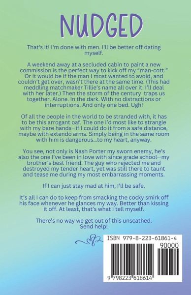 That's it! I'm done with men. I'll be better off dating myself. A weekend away at a secluded cabin to paint a new commission is the perfect way to kick off my "man-cott." Or it would be if the man I most wanted to avoid, and couldn't get over, wasn't there at the same time. (This had meddling matchmaker Tillie's name all over it. I'll deal with her later.) And if the storm of the century hadn't trapped us together. Alone. In the dark. With no distractions or interruptions. And only one bed. Ugh! Of all the people in the world to be stranded with, it had to be this arrogant oaf. The one I'd most like to strangle with my bare hands-if I could do it from a safe distance. Extendo arms would be helpful. Simply being in the same room with him is dangerous...to my heart, anyway. You see, not only is Nash Porter my sworn enemy, he's also the one I've been in love with since grade school-my brother's best friend. The guy who rejected me and destroyed my tender heart, yet was still there to taunt and tease me during my most embarrassing moments. If I can just stay mad at him, I'll be safe. It's all I can do to keep from smacking the cocky smirk off his face whenever he glances my way. Better than kissing it off. At least, that's what I tell myself. There's no way we get out of this unscathed. Send help! Nudged is a sweet, forced proximity, brother's best friend romantic comedy. It is loaded with witty banter and snark, laugh-out-loud moments, small-town charm, a loveable mutt, and swoony kisses. All the fun and feels, without the spice or swears. For lovers of Emma St Clair, Cindy Steel, and Sariah Wilson.