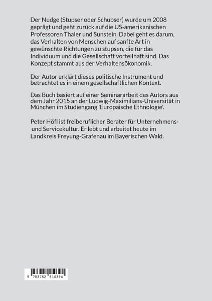 Der Nudge (Stupser oder Schubser) wurde um 2008 geprägt und geht zurück auf die US-amerikanischen Professoren Thaler und Sunstein. Dabei geht es darum, das Verhalten von Menschen auf sanfte Art in gewünschte Richtungen zu stupsen, die für das Individuum und die Gesellschaft vorteilhaft sind. Das Konzept stammt aus der Verhaltensökonomik.Der Text erklärt dieses politische Instrument und betrachtet es in einem gesellschaftlichen Kontext.Das Buch basiert auf einer Seminararbeit des Autors aus dem Jahr 2015 an der Ludwig-Maximilians-Universität in München im Studiengang 'Europäische Ethnologie'.