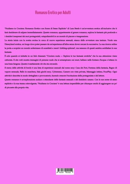 "Nudismo in Crociera: Romanzo Erotico con Scene di Sesso Esplicito" di Lara Steele è un'avventura erotica all-inclusive che ti farà desiderare di salpare immediatamente. Questo romanzo, appartenente al genere romance, esplora le fantasie più profonde e i desideri inespressi dei suoi protagonisti, catapultandoli in un mondo di piacere e trasgressione.La storia inizia con la nostra eroina in cerca di nuove esperienze sessuali, stanca delle avventure una tantum. Vuole una Disneyland erotica, un luogo dove poter passare da un'esperienza all'altra senza dover cercare la successiva. La sua ricerca online la porta a scoprire un mondo sotterraneo di scambisti e resort 'clothing-optional', ma nessuno di questi sembra soddisfare le sue fantasie.È solo quando si imbatte in un link chiamato "Crociera nuda --- Esplora le tue fantasie erotiche" che la sua attenzione viene catturata. Il sito web mostra immagini di persone nude che si arrampicano sui muri, ballano nelle fontane d'acqua e lottanoin una fossa fangosa. Questo è esattamente ciò che sta cercando.Il menu delle attività di bordo è una lista di esperienze sessuali dal nome sexy: Casa dei Fori, Fontana della fantasia, Bagno di vapore sensuale, Ballo in maschera, Sala giochi sexy, Cybersesso, Camere con vista privata, Massaggio intimo, FourPlay. Ogni attività è descritta in modo dettagliato e provocatorio, facendo crescere l'eccitazione della protagonista e del lettore.Questo romanzo è un'esplorazione audace e stimolante delle fantasie sessuali e del desiderio umano. Con le sue scene di sesso esplicito e la sua trama coinvolgente, "Nudismo in Crociera" è una lettura imperdibile per chiunque cerchi di aggiungere un po' di piccante alla propria vita.