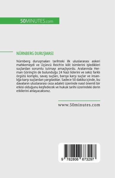 Nürnberg duru¿malar¿ tarihteki ilk uluslararas¿ askeri mahkemeydi ve Üçüncü Reich'¿n kilit isimlerini i¿ledikleri suçlardan sorumlu tutmay¿ amaçl¿yordu. Aralar¿nda Herman Göring'in de bulundu¿u 24 Nazi liderini ve sekiz farkl¿ örgütü komplo, savä suçlar¿, bar¿¿a kar¿¿ suçlar ve insanl¿¿a kar¿¿ suçlardan yarg¿lad¿lar. Sadece 50 dakika içinde, bu davalar¿n uluslararas¿ ceza adaleti üzerinde nas¿l önemli bir etkisi oldu¿unu ke¿fedecek ve hukuk tarihi üzerindeki derin etkilerini anlayacaks¿n¿z. Bu sade ve bilgilendirici kitap, Katyn katliam¿na ili¿kin kan¿tlar, davalar¿n aç¿l¿¿¿ ve kat¿l¿mc¿lar¿n ak¿beti de dahil olmak üzere, bu gergin davalar¿n kilit anlar¿n¿ kapsaml¿ bir ¿ekilde ele al¿yor. Ayr¿ca yarg¿çlar¿n tam bir biyografisini, davalar¿n bälam¿na dair de¿erli bir giri¿i ve uluslararas¿ hukukun gelece¿i üzerindeki etkilerine dair bir de¿erlendirmeyi de içeren bu kitap, ¿kinci Dünya Savä¿ sonras¿ndaki bu kritik dönem hakk¿nda ihtiyac¿n¿z olan tüm temel bilgileri size sunuyor.