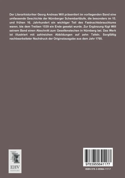 Der Literarhistoriker Georg Andreas Will präsentiert im vorliegenden Band eine umfassende Geschichte der Nürnberger Schembartläufe, die besonders im 15. und frühen 16. Jahrhundert ein wichtiger Teil des Fastnachtsbrauchtums waren, bis dem Treiben 1539 ein Ende gesetzt wurde. Zur Ergänzung fügt Will seinem Band einen Abschnitt zum Gesellenstechen in Nürnberg bei. Das Werk ist illustriert mit zahlreichen Abbildungen auf zehn Tafeln. Sorgfältig nachbearbeiteter Nachdruck der Originalausgabe aus dem Jahr 1765.