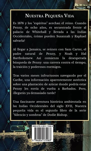 Es 1676 y los "espíritus" acechan el reino. Cuando Penny, de ocho años, es secuestrada frente al palacio de Whitehall y llevada a las Indias Occidentales, ¿cómo pueden Susannah y Raphael salvarla? Al llegar a Jamaica, se reúnen con Sam Carter, el padre natural de Penny, y Noah y Hal Bartholomew. Así comienza la desesperada búsqueda de Penny: una carrera contra el tiempo, la traición y poderosos enemigos. Tras varios meses infructuosos navegando por el Caribe, una información aparentemente auténtica sobre una plantación de azúcar donde podría estar Penny les envía de vuelta a Barbados. Pero, ¿llegarán ya demasiado tarde? Una fascinante aventura histórica ambientada en las Indias Occidentales del siglo XVII, Nuestra pequeña vida es el segundo libro de la serie "Silencio y sombras" de Dodie Bishop.