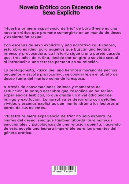 "Nuestra primera experiencia de trío" de Lara Steele es una novela erótica que promete sumergirte en un mundo de deseo y exploración sexual. Con escenas de sexo explícito y una narrativa cautivadora, esta obra es ideal para aquellos que buscan una lectura intensa y provocadora. La historia sigue a una pareja casada que, tras años de rutina, decide dar un giro a su vida sexual al introducir a una tercera persona en su relación. La protagonista, Pascaline, una hermosa morena de pechos pequeños y escote provocativo, se convierte en el objeto de deseo tanto del marido como de la esposa. A través de conversaciones íntimas y momentos de seducción, la pareja descubre que Pascaline ya ha tenido experiencias lésbicas, lo que añade un nivel adicional de intriga y excitación. La narrativa se desarrolla con detalles vívidos y escenas explícitas que mantendrán a los lectores al borde de sus asientos."Nuestra primera experiencia de trío" no solo explora los límites del deseo, sino que también aborda las dinámicas emocionales y psicológicas de una relación abierta, haciendo de esta novela una lectura imperdible para los amantes del género erótico.