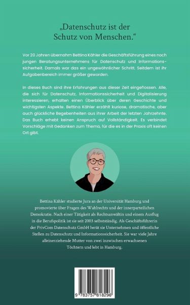 Datenschutz ist der Schutz von MenschenVor 20 Jahren übernahm Bettina Kähler die Geschäftsführung eines noch jungen Beratungsunternehmens für Datenschutz und Informationssicherheit. Damals war das ein ungewöhnlicher Schritt, der von vielen Seiten skeptisch beäugt wurde. Seitdem ist, auch durch den Siegeszug des Internets, ihr Aufgabenbereich immer größer geworden. In dieses Buch sind ihre Erfahrungen aus dieser Zeit eingeflossen. Nicht nur diejenigen, die Datenschutz, Informationssicherheit und Digitalisierung gestaltenLeser und Leserinnen, erhalten hier einen Überblick über die Geschichte und die wichtigsten Themen im Kontext. Die ausgewählten Beispiele sind kuriose, dramatische, aber auch glückliche Begebenheiten aus Bettina Kählers Arbeit der letzten Jahrzehnte. Sie sollen illustrieren, warum Datenschutz elementar wichtig ist, welche Fragen sich in der Praxis stellen und welcher formale Rahmen um sie herum besteht. Das Buch erhebt keinen Anspruch auf Vollständigkeit und auch nicht darauf, ein Ratgeber im klassischen Sinn zu sein. Es ist ein beratender Erfahrungsbericht, der Anlass zum Nachdenken und Nachmachen insbesondere für diejenigen geben möchte, denen diese Themen bislang eher fremd sind. Es verbindet Vorschläge zur Gestaltung des Datenschutzes, der Informationssicherheit und der Digitalisierung mit Gedanken zum Thema, für die es in der Beratungspraxis oft keinen Ort gibt.