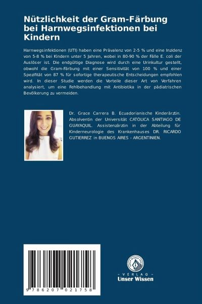 Harnwegsinfektionen (UTI) haben eine Prävalenz von 2-5 % und eine Inzidenz von 5-8 % bei Kindern unter 5 Jahren, wobei in 80-90 % der Fälle E. coli der Auslöser ist. Die endgültige Diagnose wird durch eine Urinkultur gestellt, obwohl die Gram-Färbung mit einer Sensitivität von 100 % und einer Spezifität von 87 % für sofortige therapeutische Entscheidungen empfohlen wird. In dieser Studie werden die Vorteile dieser Art von Verfahren analysiert, um eine Fehlbehandlung mit Antibiotika in der pädiatrischen Bevölkerung zu vermeiden.