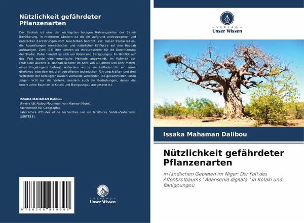 Der Baobab ist eine der wichtigsten holzigen Nahrungsarten der Sahel-Bevölkerung. In mehreren Ländern ist die Art aufgrund anthropogener und natürlicher Zerstörungen vom Aussterben bedroht. Ziel dieser Studie ist es, die Auswirkungen menschlicher und natürlicher Einflüsse auf den Baobab aufzuzeigen. Zwei (02) Orte dienten als Versuchsfelder für die Durchführung der Studie. Dabei handelt es sich um Kotaki und Banigoungou. Im Hinblick auf das Feld wurde eine empirische Methode angewandt. Im Rahmen der Feldstudie wurden 31 Baobab-Besitzer im Alter von 49 Jahren und älter mittels eines Fragebogens befragt. Außerdem wurde ein Leitfaden für ein semi-direktives Interview mit drei betroffenen technischen Führungskräften und drei Vertretern der beteiligten lokalen Verbände verwendet. Die gesammelten Daten zeigen nicht nur die Vorteile, sondern auch die Bedrohungen, denen die untersuchte Baumart in Kotaki und Banigoungou ausgesetzt ist.