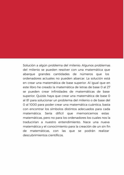Solución a algún problema del milenio: Algunos problemas del milenio se pueden resolver con una matemática que abarque grandes cantidades de números que los ordenadores actuales no pueden abarcar. La solución está en crear una matemática de base superior. Al igual que en este libro he creado la matemática de letras de base 0 al 27 se pueden crear infinidades de matemáticas de base superior. Quizás haya que crear una matemática de base 0 al 81 para solucionar un problema del milenio o de base del 0 al 1000 para poder crear una matemática cuántica, basta con encontrar los símbolos distintos adecuados para cada matemática. Sería difícil que memoricemos estas matemáticas, pero no para los ordenadores los cuales nos la traducirían a nuestro entendimiento. Nace una nueva matemática y el conocimiento para la creación de un sin fin de matemáticas, con las que se podrán realizar nuevos descubrimientos científicos.