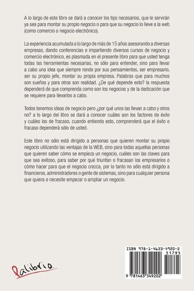 A lo largo de este libro se dará a conocer los tips necesarios, que le servirán ya sea para montar su propio negocio o para que su negocio lo lleve a la web (como comercio o negocio electrónico). La experiencia acumulada a lo largo de más de 15 años asesorando a diversas empresas, dando conferencias e impartiendo diversos cursos de negocio y comercio electrónico, es plasmada en el presente libro para que usted tenga todas las herramientas necesarias, no sólo para entender, sino para llevar a cabo una idea que siempre rondo por sus pensamientos, ser empresario, ser su propio jefe, montar su propia empresa. Palabras que para muchos son sueños y para otros son realidad. ¿De qué depende esto? la respuesta dependerá de que comprenda como son los negocios y de la dedicación que se requiere para llevarlos a cabo. Todos tenemos ideas de negocio pero ¿por qué unos las llevan a cabo y otros no? a lo largo del libro se dará a conocer cuáles son los factores de éxito y cuáles los de fracaso, cuando entienda esto, comprenderá que el éxito o fracaso dependerá sólo de usted. Este libro no sólo está dirigido a personas que quieren montar su propio negocio utilizando las ventajas de la WEB, sino para todas aquellas personas que quieren saber cómo se empieza un negocio, cuáles son las claves para que sea exitoso, para saber por qué triunfan o fracasan los empresarios o cómo hacer para que el negocio crezca, por lo tanto no sólo está dirigido a financieros, administradores o gente de sistemas, sino para cualquier persona que quiera o necesite empezar o ampliar un negocio.