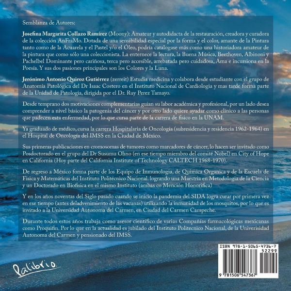 Semblanza de Autores: Josefina Margarita Collazo Ramírez (Moony): Amateur y autodidacta de la restauración, creadora y curadora de la colección AnFraMo. Dotada de una sensibilidad especial por la forma y el color, amante de la Pintura tanto como de la Acuarela y el Pastel y/o el Óleo, podría catalogase más como una historiadora amateur de la pintura que como solo una coleccionista. La enternece la lectura, la Buena Música, Beethoven, Albinoni y Pachelbel Dominante pero cariñosa, terca pero accesible, arrebatada pero cuidadosa, Ama e incursiona en la Poesía. Y sus dos pasiones principales son los Colores y la Luna. Jerónimo Antonio Quiroz Gutiérrez (zerreit): Estudia medicina y colabora desde estudiante con el grupo de Anatomía Patológica del Dr. Isaac Costero en el Instituto Nacional de Cardiología y más tarde forma parte de la Unidad de Patología, dirigida por el Dr. Ruy Perez Tamayo. Desde temprano dos motivaciones complementarias guían su labor académica y profesional, por un lado desea comprender a nivel básico la patogenia del cáncer y por otro lado quiere ayudar como clínico a las personas que padecen esta enfermedad, por lo que cursa parte de la carrera de físico en la UNAM. Ya graduado de médico, cursa la carrera Hospitalaria de Oncología (subresidencia y residencia 1962-1964) en el Hospital de Oncología del IMSS en la Ciudad de México. Sus primeras publicaciones en cromosomas de tumores como marcadores de cáncer, lo hacen ser invitado como Posdoctorado en el grupo del Dr. Susumu Ohno (en ese tiempo miembro del comité Nobel) en City of Hope en California (Hoy parte del California Institute of Technology CALTECH 1968-1970). De regreso a México forma parte de los Equipo de Inmunología, de Química Orgánica y de la Escuela de Física y Matemáticas del Instituto Politécnico Nacional, logrando una Maestría en Metodología de la Ciencia y un Doctorado en Biofísica en el mismo Instituto (ambas con Mención Honorífica). Y en los años noventas del siglo pasado cuando se inició la pandemia del SIDA logra curar por primera vez en ese tiempo (antes del advenimiento de las vacunas) utilizando la inmunidad de los mosquitos, por lo que es invitado a la Universidad Autónoma del Carmen, en Ciudad del Carmen Campeche. Durante todos estos años trabaja como asesor científico de varias compañías farmacológicas mexicanas como Proquifin. Por lo que en la actualidad es jubilado del Instituto Politécnico Nacional, de la Universidad Autonóma del Carmen y pensionado del IMSS.