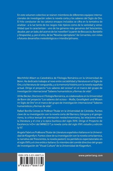 Mechthild Albert es Catedrática de Filología Románica en la Universidad de Bonn. Ha dedicado trabajos al nexo entre sociabilidad y literatura en el Siglo de Oro, a la literatura de vanguardia, y a la memoria histórica en la novela española actual. Dirige el proyecto "Los saberes del ocioso" en el marco del grupo de investigación internacional "Saberes humanísticos y formas de vida". Ulrike Becker, Doctora en Filología Románica, es colaboradora en la Universidad de Bonn del proyecto "Los saberes del ocioso - Muße, Geselligkeit und Wissen im Siglo de Oro" en el marco del grupo de investigación internacional "Saberes humanísticos y formas de vida". Rafael Bonilla Cerezo es Profesor Titular en la Universidad de Córdoba. Puntos clave de su investigación son la novela corta del Barroco, Góngora y el gongorismo, la crítica textual de orientación neolachmanniana, las relaciones entre la literatura y el cine y la épica burlesca del siglo XVIII. Dirige el Proyecto de Excelencia I+D+i del MINECO "La novela corta del siglo XVII: estudio y edición (y II)". Angela Fabris es Profesora Titular de Literatura española e italiana en la Universidad de Klagenfurt. Puntos clave de su investigación son la novela corta barroca, la narrativa del Trescientos, la novela pastoril, los periódicos espectatoriales en el siglo XVIII y el cine erótico italiano. Es miembro del comité directivo del grupo de investigación de "Visual Culture" de la Universidad de Klagenfurt.