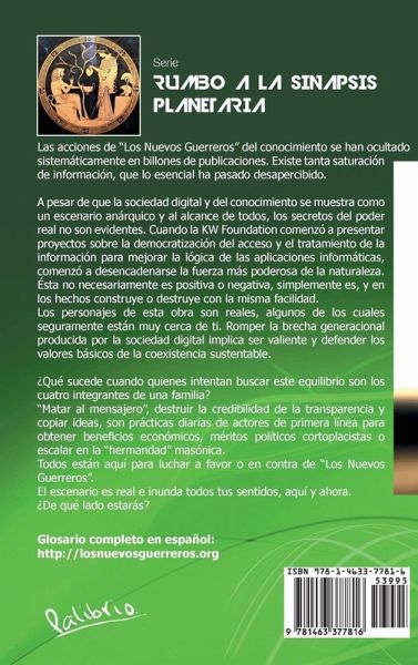 Las acciones de "Los Nuevos Guerreros" del conocimiento se han ocultado sistemáticamente en billones de publicaciones. Existe tanta saturación de información, que lo esencial ha pasado desapercibido. A pesar de que la sociedad digital y del conocimiento se muestra como un escenario anárquico y al alcance de todos, los secretos del poder real no son evidentes. Cuando la KW Foundation comenzó a presentar proyectos sobre la democratización del acceso y el tratamiento de la información para mejorar la lógica de las aplicaciones informáticas, comenzó a desencadenarse la fuerza más poderosa de la naturaleza. Ésta no necesariamente es positiva o negativa, simplemente es, y en los hechos construye o destruye con la misma facilidad. Los personajes de esta obra son reales, algunos de los cuales seguramente están muy cerca de ti. Romper la brecha generacional producida por la sociedad digital implica ser valiente y defender los valores básicos de la coexistencia sustentable. ¿Qué sucede cuando quienes intentan buscar este equilibrio son los cuatro integrantes de una familia? "Matar al mensajero", destruir la credibilidad de la transparencia y copiar ideas, son prácticas diarias de actores de primera línea para obtener beneficios económicos, méritos políticos cortoplacistas o escalar en la "hermandad" masónica. Todos están aquí para luchar a favor o en contra de "Los Nuevos Guerreros". El escenario es real e inunda todos tus sentidos, aquí y ahora. ¿De qué lado estarás?