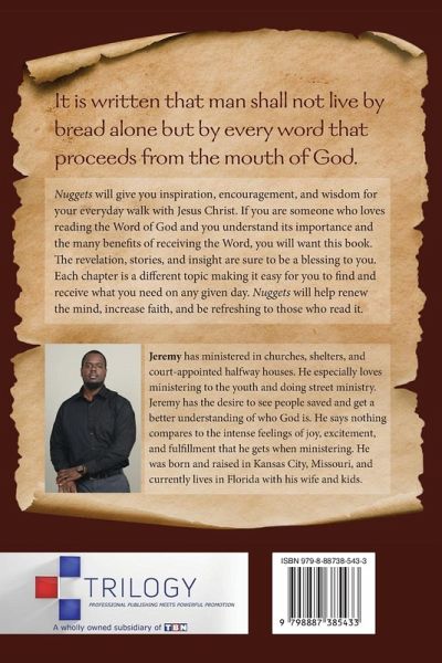 It is written that man shall not live by bread alone but by every word that proceeds from the mouth of God. Nuggets will give you inspiration, encouragement, and wisdom for your everyday walk with Jesus Christ. If you are someone who loves reading the Word of God and you understand its importance and the many benefits of receiving the Word, you will want this book. The revelation, stories, and insight are sure to be a blessing to you. Each chapter is a different topic making it easy for you to find and receive what you need on any given day. Nuggets will help renew the mind, increase faith, and be refreshing to those who read it.
